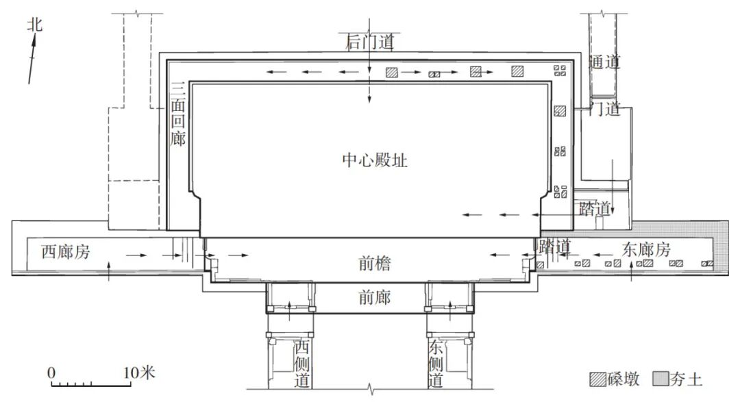 六号建筑使用时间较长,它的情况比七号建筑复杂很多,故有必要对六号建筑的平面布局形制进行进一步的剖析和解释。(一)中心台基及三面回廊六号建筑中心台基较七号建筑体量缩小,南面向北缩进1.5米,东、西、北三面夯土台基向中心缩进3.2米,但后檐和东山面檐柱位置并未发生变化,即原柱网布局很可能得以保留,推测是由于火灾严重破坏了建筑外檐,在修缮中利用原有中心柱网,局部改建为二层。不过,东、西、北三面恐非常见回廊。首先,从夯土边界到台基边界仅3.2米,而考古发现的外檐柱对应磉墩位于3.2米廊道的居中部位,即3.2米的“回廊”中线附近有连续的立柱。根据图纸推算其出檐距离接近2米,那么建筑室内的“回廊”,仅余1米出头,非常局促。其次,“回廊”区域围绕中心台基东、西、北三面,向南的方向被东西配廊打断,并未形成环线。也就是说,该区域只能从北面通过后门道进入。那么,回廊中的立柱应是建筑首层的檐柱,回廊区域相当于副阶,但并非长时间逗留之地,而可能只是登上建筑二层高台的通道。(二)局部前廊与七号建筑相似,六号中心台基南侧也设“东西门阙”,并随中心台基南界向北移动1.5米[36]。有所不同的是,在六号建筑基址东阙西南角和东南角皆发现柱础。柱础为管脚榫,且向北(殿内)开卯口,卯口较深,说明前廊构架与殿内联系紧密。“东门阙”南面设有门道,正对东侧道,东、西残存墙基,北面紧贴中心建筑夯土台基,形成面积约15平方米的封闭空间,但两阙之间(中心台基正面三间以南)的情况并不清楚。考虑到六号建筑与七号建筑的传承关系,笔者倾向于认为东西门阙之间也相连成为局部前廊。(三)东西廊房东廊房北部夯土墙宽2.1米,东部夯土墙宽1.8米,与六号主体建筑结构不同,也与天堂建筑有着明显的构造差异。考虑到六号建筑和东廊房乃证圣元年受天堂的大火波及而改建,可推测东廊房东北方向建设超出常态的厚重夯土墙,可能与防火需求有关。从这个角度出发,六号建筑基址中心台基内缩、外围回廊,中心以砖包夯土的做法,很可能也与防火需求有关。东廊房东面和北面的夯土墙,将其与北部建筑院落隔离,而南面不设南墙,使用开敞的立柱,可知南向为东廊房最重要的朝向,且人流量可能较大。然而,考古发现南面的一排柱子有明显的改动痕迹,即从早期比较规则、大小相近的磉墩(图6中双数磉墩),分别向东移动1米左右,替换为尺寸较大但规格不一的磉墩(图6中单数磉墩),其中1号磉墩已紧靠东夯土墙。这一改动,并未改变东廊房的开间数或开间进深尺寸,只是将柱网向东略做偏移。其改动原因,应与向东1米的偏移需求有关。在东廊房西端发现有通往中心台基的踏道,而最西侧的10号前檐柱与残存踏道距离仅1米余,那么东廊房前檐柱的东移,可能与通往中心台基的踏道建设有关。此外,考古发掘发现,在东廊房后设南北隔墙与二号庭院形成南北通道,并在东廊房北墙外西端设一个踏道。与这个踏道对应的是,在中心台基东侧回廊东南角有一个长约2.85米的夯土后壁内折0.3米,且不用砖贴壁,发掘报告推测这里为通往中心建筑二层的外楼梯(图6)。这段南北隔墙叠压在七号基址的散水之上,但又插入东廊房北夯土墙。这说明七号建筑被天堂火灾波及并改建为六号建筑之后,又进行了二次改建。