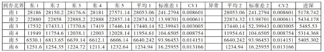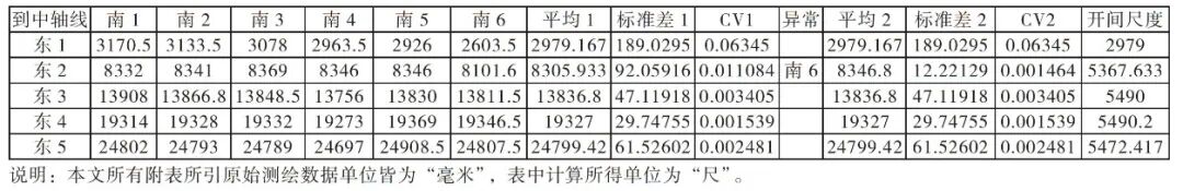 根据上述梳理可知,几组建筑的相对早晚关系比较清晰,考古报告对其建造、使用和改建的大致年代也有一定的判断,但仅给出了时代范围,尚未与文献相对应。这些建筑遗址的形制与其时代、功能的关系并不清楚,遗址本身也无法与历史事件相关联。本文试根据考古地层和遗址的用尺情况(平面柱网、台基尺寸、砖瓦柱础等方面)初步分析遗址年代,继而从遗址现象出发,结合历史文献记载,还原不同时期建筑的建设、修复、改造或重建过程,并探讨其改造原因及建筑功能和空间的关系。一、隋武安殿(七号建筑)位于建筑基址最早的地层中。中心为夯土台基,残高1米,为红褐土夯筑而成。夯土台基下面预埋整齐的基石。这些基石都是长条形石板,有两块为一组的,也有一块一组的,它们的行距、间距都是5米左右。青石板与上面磉墩相对应。这些磉墩间距各以中心点计为5米[13]。由于《隋唐洛阳城天堂遗址发掘报告》图一四中绘制了青石板较为准确的位置和形制,本文不简单以磉墩间距5米为基数,而是以考古发掘的殿址东半部青石板为基础,核算建筑轴线,进而获知开间和进深尺寸。考虑到磉墩和青石板有破损和偏移,故以平均值计算建筑轴线。南北方向轴线以夯土台基北界为基准线,测算各青石板中心点与基准线的距离,进而测算平均数。东西方向轴线以考古发掘所设中轴线为基准线,测算距离和平均数。在此过程中,剔除偏差超过两个标准差的数据,再次求平均值。以测算出的平均值作为平面尺度的理想值,进行用尺计算(附表1、2)。经测算,七号建筑当以1尺=29.5厘米为标准用尺(附表3、4)[14]。附表1 七号建筑开间数据计算表