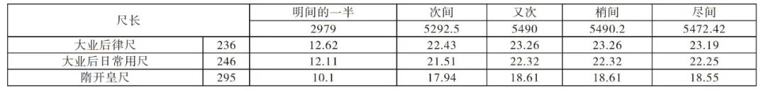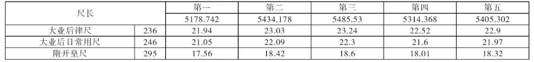 [15]“《隋书·律历志》十五等尺中所录隋代之尺,分律尺与官方颁定的常用尺两类。隋虽仅历二世,度量衡则有二次大变更,即文帝沿袭北周之大制,而炀帝则依复‘古’制。隋文帝立国之初,以后周市尺为官定之尺(开皇官尺),令百司用之。……一尺之长约合今29.5厘米……炀帝改用小制……日常用尺用宋氏尺长24.6厘米,律尺改用梁表尺,长23.6厘米。”丘光明等:《中国科学技术史·度量衡卷》第301页,科学出版社,2001年。