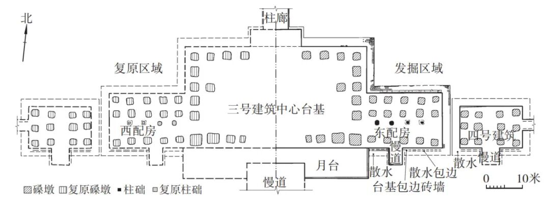 根据文献记载,敬宗即位后欲巡幸东都,因宫阙荒弛而罢[40]。其后蔡贼秦宗权掠洛,焚烧宫阙,洛都衰败至极[41]。乾宁三年(公元896年),朱全忠请驾迁洛[42]。天祐元年(公元904年),因昭宗幸洛[43],对洛阳宫进行了一次大规模的建设和修复。三号建筑应是这一次修缮活动的结果。自此以后,这一殿宇作为洛阳宫西辅轴线上的大殿,再一次登上历史舞台。天祐二年(公元905年)五月,由宣政殿改贞观殿[44]。后梁开平三年(公元909年)正月,改贞观殿为文明殿[45]。这座建筑形制的变化,反映了建筑技术的进步和发展。其建筑特点如下。其一,中心殿址出现减柱造,可能使用了纵向大额承重结构,使得明间面阔达13米,实现了建筑构架的突破。三号建筑基址的结构设计非常大胆,跟此前的建筑构架相比极具创新性,建筑室内空间感很强,但因构架跨度太大也造成了结构的弱点。其二,中心殿址前设月台,后有柱廊。月台是五代时期新产生的殿前空间,这时的月台面积较小,仅占大殿面积的1/4~1/3。中心殿址南面不设东西侧道,仅建中央御道,可见突出御道的理念逐渐强化。其三,中心殿址两侧不再是配廊,而出现与中心殿址相连的配房,且配房前檐与大殿平齐,不再向后缩进,更加突出建筑的立面规模和气势。这一建筑布局变化的原因,大概是由于配房与中心殿址的柱网东西相对,共同形成整体构架所致。其四,在中心殿址及其配房的两侧还设有配殿,实为文献中的“