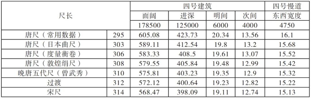 第一,中心夯土台基向南北扩展,原南面前廊和东西侧道被南北约9米的月台覆盖,月台南面正中设有慢道,由北至南向下倾斜成坡。中心台基北面也有一个突出的小平台,后接后门通道。台基、慢道周围都有砖壁包边,厚0.4米。从发掘区域最西端檐柱至中轴线为6.8米的距离可知,明间开间超过13米。这是一个惊人的数字。但从建筑格局看,却是可以自洽的。一方面,考古发现月台前面的慢道刚好位于明间位置,东西宽15.1米,可与明间开间契合,且后檐明间开间、后门平台宽度皆与此相近;另一方面,东侧附属四号建筑明间开间达6米,若认为上述主殿约13米的明间实为三间,则主殿明间开间尺度反小于配殿明间开间尺度,是不合理的。由此可知,正殿明间开间超过13米的跨度很可能就是三号建筑最初的做法。那么,正殿明间很可能使用了大额承重,类似五台山佛光寺文殊殿的殿内建筑构造。第二,殿内大面积使用减柱。考古报告显示,三号建筑基址磉墩从南向北共六排,第一排至第四排的距离为15米,第四排至第六排的距离为8米,其间内柱极少。三号建筑基址外圈柱网相对密集、内部几乎无柱的设置是令人惊异的,其尺度远超目前存世的唐五代建筑。对比天堂遗址内外圈柱网距离9米的跨度,含元殿南檐柱与南排金柱9.2米的跨度,可知后檐三排柱间8米的跨度是可能的,约为四架椽,而前檐15米的梁架跨度则确实过大。观察进深方向,后四间距离接近,故推测可能以第四排柱为中心,前后各施四椽栿,即形成八架椽屋前后四椽栿的构架主体,再在前檐增加两架椽的前廊。但第四排柱只用两根内柱,且两柱间距超过20米,即使使用大额承重柱恐也难以支撑构架,故推测两柱之间可能另有支撑柱存在。第三,原东廊房改造为进深两间的东配房,与中心台基连为一体,形成后凸形的建筑平面。考古发现东配房的三排檐柱,与中心夯土台基的前三排柱在同一柱网轴线上,那么东配房的建筑构架很可能与主体建筑的构架形成纵架关系,连为一体。这组建筑建成的年代,从遗址地层和出土遗物看,应在唐开元以后。以隋及唐前期的尺长29.5厘米和宋代尺长31.4厘米分别衡量其平面主要数据,所得数值均无法取得整尺或半尺。考虑到唐开元后,尺长有所增长,达唐代常用尺30.6厘米,经唐末至五代,尺长又有增加[39]。将前辈学者推算的唐中后期用尺度量与三号、四号建筑各建筑尺度校核,认为尺长为30.6~31厘米比较接近三号、四号建筑数据,故推测这组建筑建成于唐末(附表6、7)。附表6 三号建筑尺寸