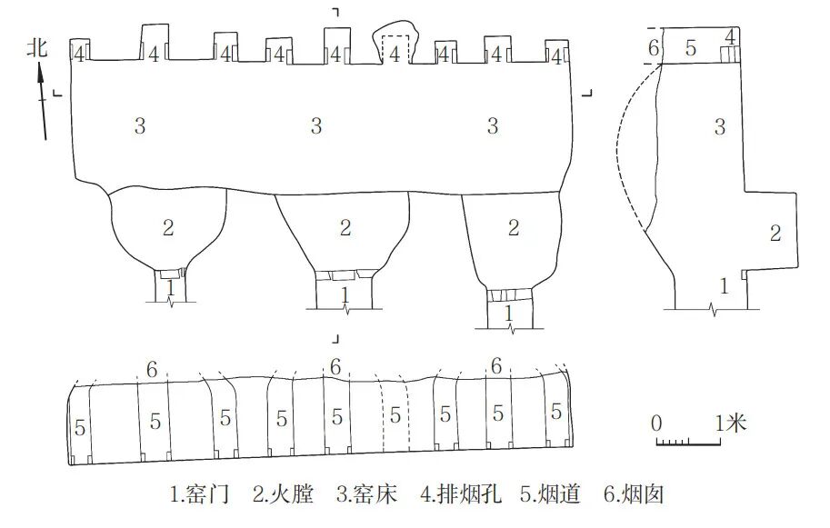 瀍河区房管局、小北门、洛阳东站南侧、新街口等多处窑址[25]属同一个连续烧造的大窑场。据考古发现,瀍河区房管局窑址窑炉所处层位不一,分别叠压于唐代文化层、金元时期文化层下,或叠压于现代层下并直接打破生土,窑址面积大,窑炉密集,多为对窑和三室组合窑,火膛灰坑中积存的草木灰反映出这些砖瓦窑都以木柴为燃料。砖瓦窑分大、小两种形制,大型和小型窑炉分区明确,且盛唐时期的大型窑叠压并打破小型窑,故小型窑早于大型窑,该窑址的建造使用时代不晚于唐代。2004年发掘的洛阳东站南侧窑址中的ZY1~5五座窑炉保存较好。ZY1、ZY5都为单窑,而ZY2~4则为三窑共用一个操作坑的“品”字形组合窑,ZY1、ZY2、ZY4的窑门及窑室顶部保存较为完整。根据排烟结构的不同,发掘者将5座窑炉分为两种类型:一种为烟道型如ZY1~4,直接在窑室后壁上凿挖3条沟槽作为烟道,沟槽上端凿穿地表作为烟囱,窑室面积较小;另一种为烟室型如ZY5,窑室面积较大。以上考古发现证明洛阳城隋唐砖瓦窑炉存在由小向大发展的趋势,排烟设施则存在由烟道向烟室过渡的技术革新。大、小型窑炉形制基本相同。瀍河东岸中国第一拖拉机厂东关分厂窑址发现的窑炉虽也都属“穿掘为窑”的马蹄形窑,但窑炉建筑更讲究一些,出现了砖砌窑。其中Y1壁较直,除近窑门处外壁皆砖砌,Y3~5皆土壁内弧弯曲、窑门口局部包砖加固[26]。另外,在瀍河两岸窑场多座窑炉的窑门底部发现有一凹形进风孔(如瀍河房管局窑址Y5)[27],这种窑门底部进风孔的设计相当先进、合理,在洛阳地区一直延续使用到明代砖窑中[28]。皇城右掖门西北窑址的Y7为结构特殊的联窑,由三座窑炉同向并列构成,窑床相通无隔墙,后壁掏挖九条沟槽作为烟道,沟槽上端凿穿地表作为烟囱,前置三座并列窑门及相应的三个火膛(见图三)。此类型窑装烧量很大,三个窑门同时点火不仅可加速提升窑内温度,还可节约燃料,缩短烧成时间。此联窑是否为目前考古发现的最早例证,尚难断定,但在宋代瓷器生产中此类联窑被广泛使用,如宋代河南禹州神垕镇钧瓷窑址、汝州宝丰清凉寺汝窑遗址及河北观台镇磁州窑址中也都有发现[29],且有两座或多座窑炉相联的多种筑窑形式。