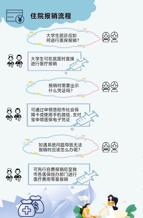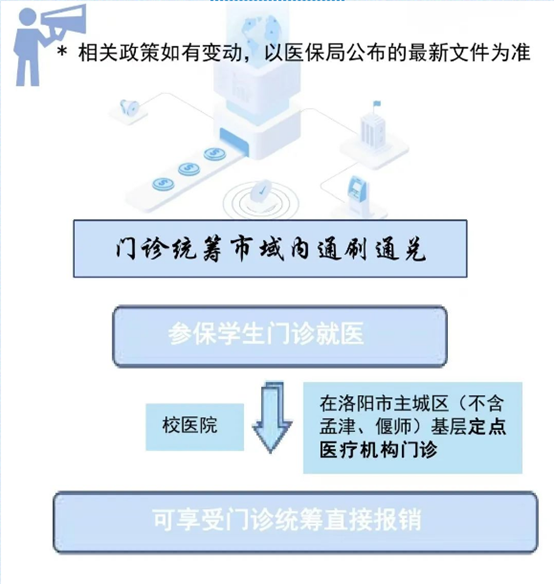 我市参保大学生在洛阳市主城区(不含孟津、偃师)内基层定点医疗机构门诊就医,均可享受门诊统筹直接报销。