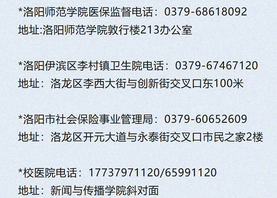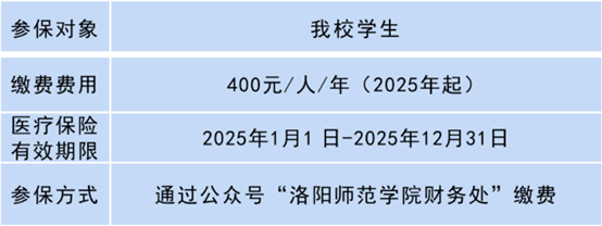 目前,洛阳市基本医疗保险制度包括两种类型:城镇职工医保和城乡居民医保两项基本医疗保险制度,覆盖了洛阳市全体城镇职工和城乡居民。我校全体学生统一参加洛阳市城乡居民医保。
