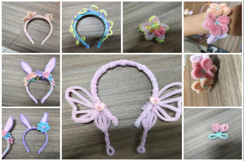 此次活动旨在通过“扭扭棒”这一富有创意和趣味性的手工材料,激发参与者的创造力和想象力,让他们在制作过程中体验到美的力量和魅力。活动现场,五颜六色的扭扭棒和各式各样的手工材料摆满了桌面。参与者们纷纷拿起扭扭棒,发挥自己的创意和想象力,开始制作各种独特的手工艺品。同学们通过线上教学视频学习了制作扭扭棒作品的技巧和方法,同学们都大胆尝试,勇于创新,自信地投入到创作中,现场氛围热烈而活跃。活动结束后,有的制作了精美的花束,有的则打造了可爱的动物造型,还有的创意无限,将扭扭棒与其他材料结合,创作出独具特色的作品。在此次活动各种充分发挥自己的想象力和创造力,用“扭扭棒”制作出了各种各样精美的手工艺品。这些作品不仅展示了同学们的巧思妙想,更在无形中提升了他们的审美情趣和动手实践能力。