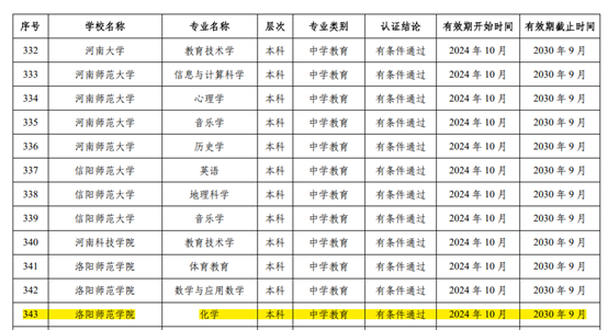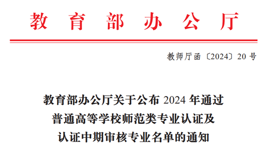 近日,教育部办公厅下发了《教育部办公厅关于公布2024年通过普通高等学校师范类专业认证及认证中期审核专业名单的通知》(教师厅函〔2024〕20号)。我院化学专业顺利通过教育部师范类专业第二级认证,认证结论有效期为六年(2024年10月至2030年9月)。