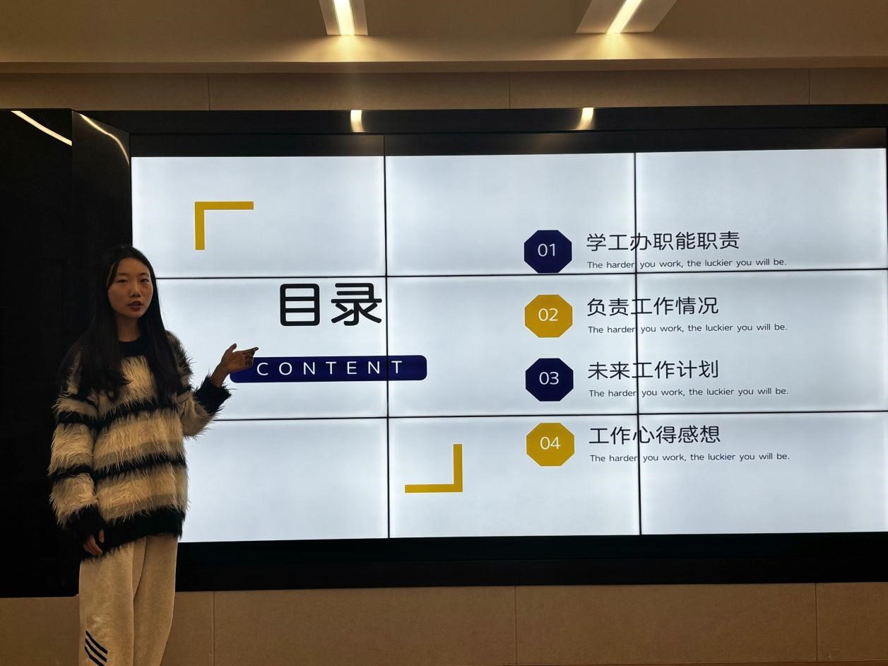 随后,与会老师依次为获得一等奖、二等奖、三等奖的同学颁奖。在颁奖环节结束后,获得一等奖的李梦同学作为学生代表上台发言并与参会学生干部分享交流。她讲述了自己担任学生干部以来的工作经验和心得体会,也回答了部门学生干部们提出的问题,最后她鼓励大家要勇于担当、敢于创新,为书院的发展贡献自己的力量。