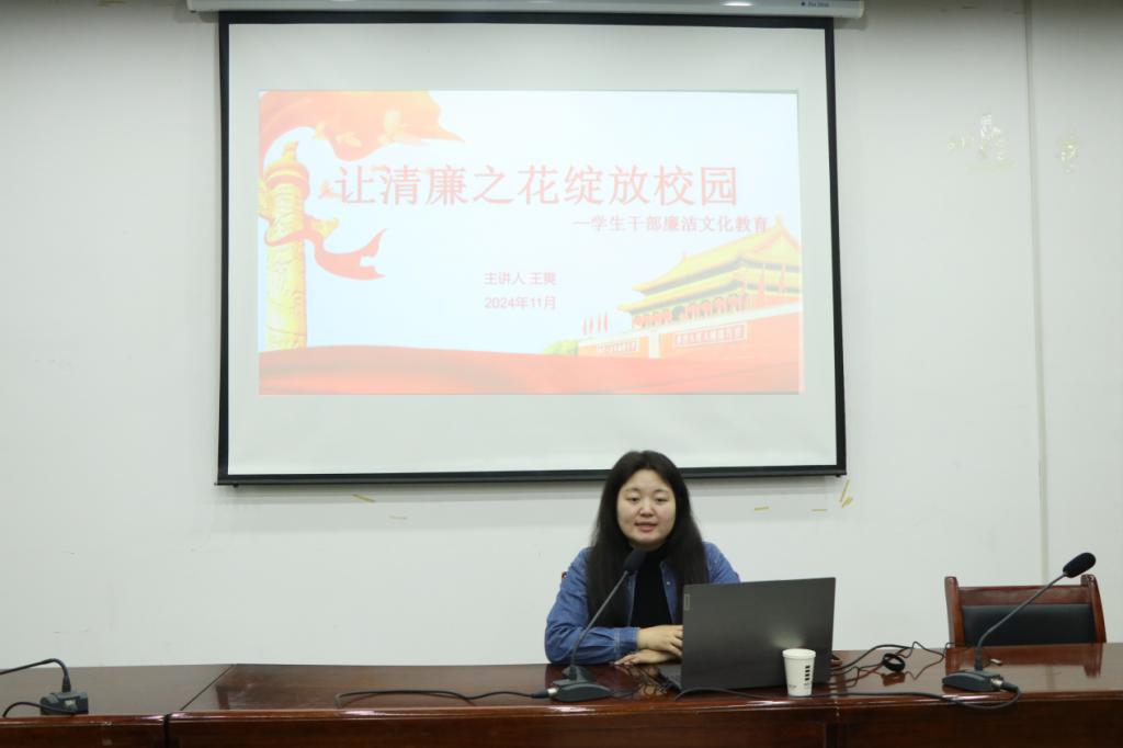 培训第二讲,王爽老师以“让清廉之花绽放校园”的主题对学生干部进行具体而全面的廉洁文化教育。她从认识腐败问题讲到腐败案例,使学生干部树立起“反腐倡廉,激浊扬清”的坚定理念。紧接着,她从“扬清廉之浪”“存敬畏之念”“怀感恩之心”“享知足之乐”四部分内容,对学生干部的日常纪律做出明确要求,呼吁大家做廉洁大学生,做到知行合一。最后,王爽老师以周恩来总理的话教导大家要常怀感恩之心,做到知足常乐,为党的事业和立雪书院的建设贡献力量。