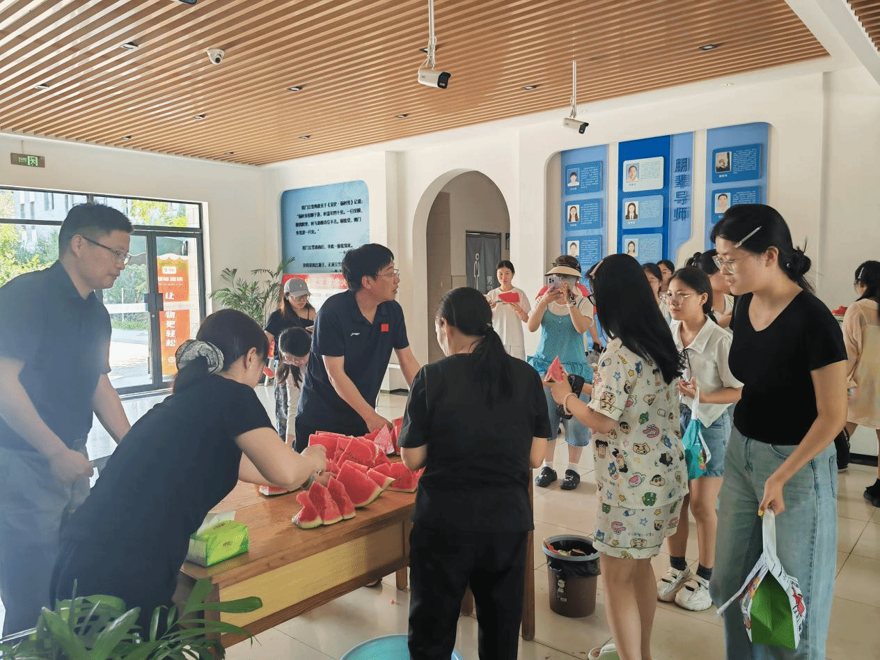 7月30日上午,立雪书院学生社区一楼大厅里,清甜的瓜香与暖心的话语交织成盛夏最动人的风景。书院班子成员、部分生活导师和育人导师挽起袖子,切分西瓜,为暑期留校备考的考研学子送上盛夏清凉。