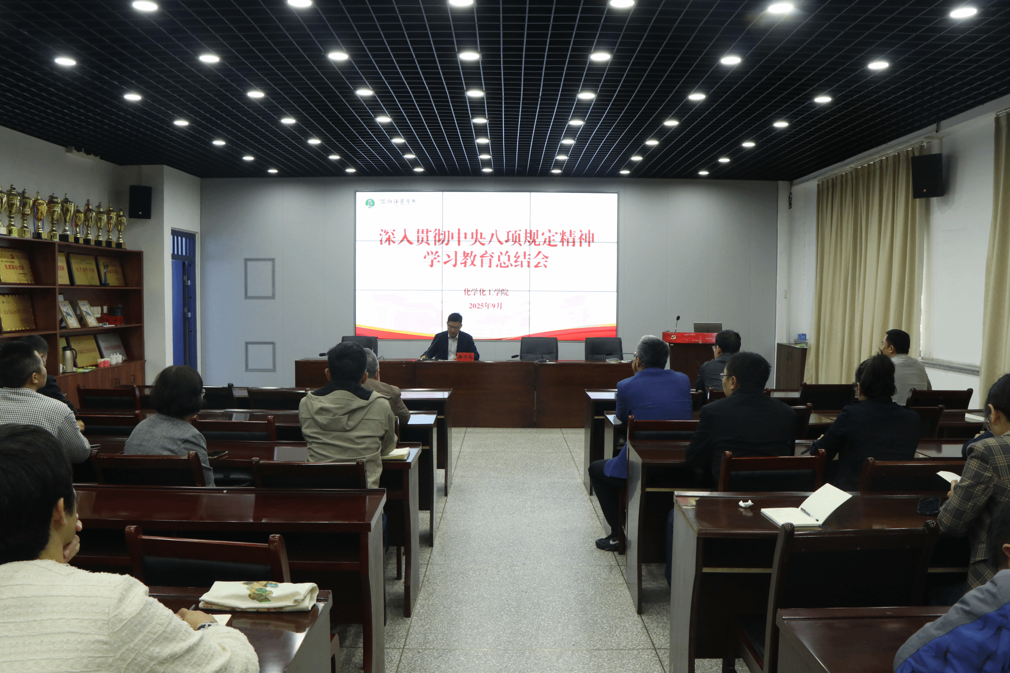 9月22日上午,化学化工学院于化学楼215会议室召开深入贯彻中央八项规定精神学习教育总结会,学院全体教师参会。会议由学院党委书记骆方成主持。