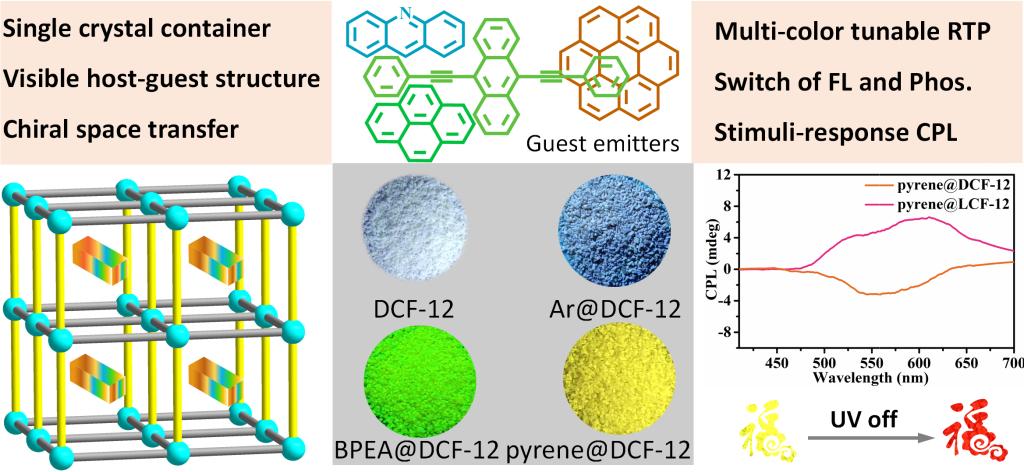 在微纳尺度揭示多级手性的演变规律对生命、化学和材料等学科至关重要。鉴于当前主导的手性光学自组装材料存在有序度低,无法获得精准的微观结构这一不足之处,该团队通过手性网格化学原理,设计合成了一对具有光学活性的金属有机框架DCF-12/LCF-12,并以此为基础,构筑了一系列主客体化合物,进而通过单晶衍射,成功获得了主客体化合物的精准结构,这就为揭示多级手性的传递和放大提供了最直接最精确的证据。同时,这些主客体化合物还展示出客体主导的圆偏振光,为发展手性光学材料提供了重要借鉴。