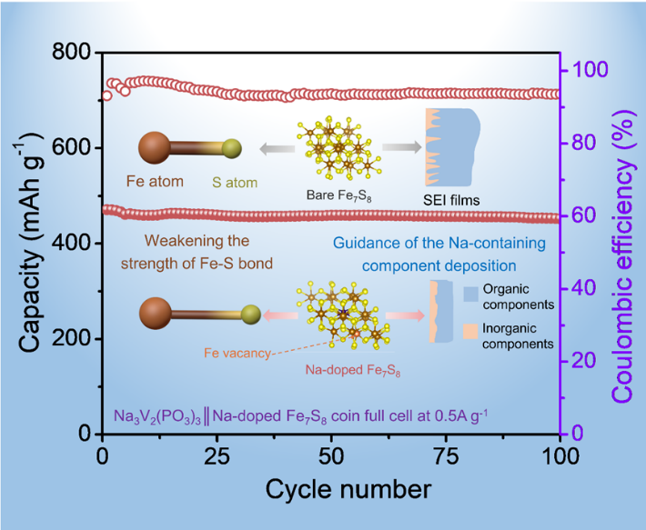 过渡金属硫化物在钠离子电池负极材料中有较大的应用前景。然而它们经常在循环初期展现出明显的容量衰减过程。基于此,作者通过将钠盐与Fe-MOF前驱体硫化,得到一种钠掺杂的Fe7S8。研究结果表明,钠的预嵌入,不仅能弱化Fe-S键键强,还可以调控样品的能带结构,进而加快Na+与Fe7S8的反应动力学过程,缓解硫化铁在循环初期的容量衰减情况。此外,预嵌入的钠离子还可诱导SEI膜中含钠无机物质的均匀沉积,有助于得到薄且均匀的SEI膜。因此,Na-Fe7S8展现出优异的循环稳定性和倍率性能(10A/g下循环1500次,容量达503mAh/g)。