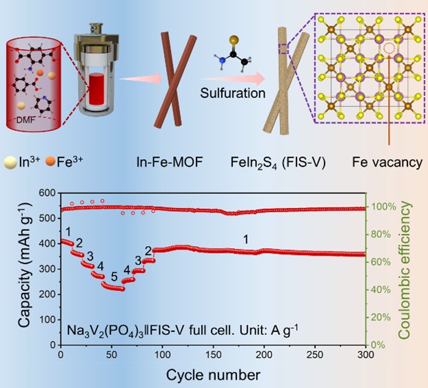 相比于单金属硫化物,双金属硫化物负极材料具有更多氧化还原位点、离子传输通道以及可调控的电压平台,在钠离子电池领域中受到越来越多的关注。该工作以双金属In-Fe-MOF为前驱体,构建了含有Fe空位的硫硼尖晶石相FeIn2S4负极材料(FIS-V)。与Fe2+替代方法相比,双金属MOF前驱体使得产物电化学性能提升,而且制备过程也得到简化。FIS-V中的Fe空位调节了Fe的d带中心,降低了Fe-S键的强度,促进了钠化反应的动力学,提高了结构的可逆性。此外,FIS-V具有由Fe空位诱导的富含无机物成分的薄而稳定的SEI薄膜。在多孔N、S共掺杂碳基体的支撑下,FIS-V展现出优异的电化学性能。该研究为调节双金属硫化物结构提供了一种有前景的策略。