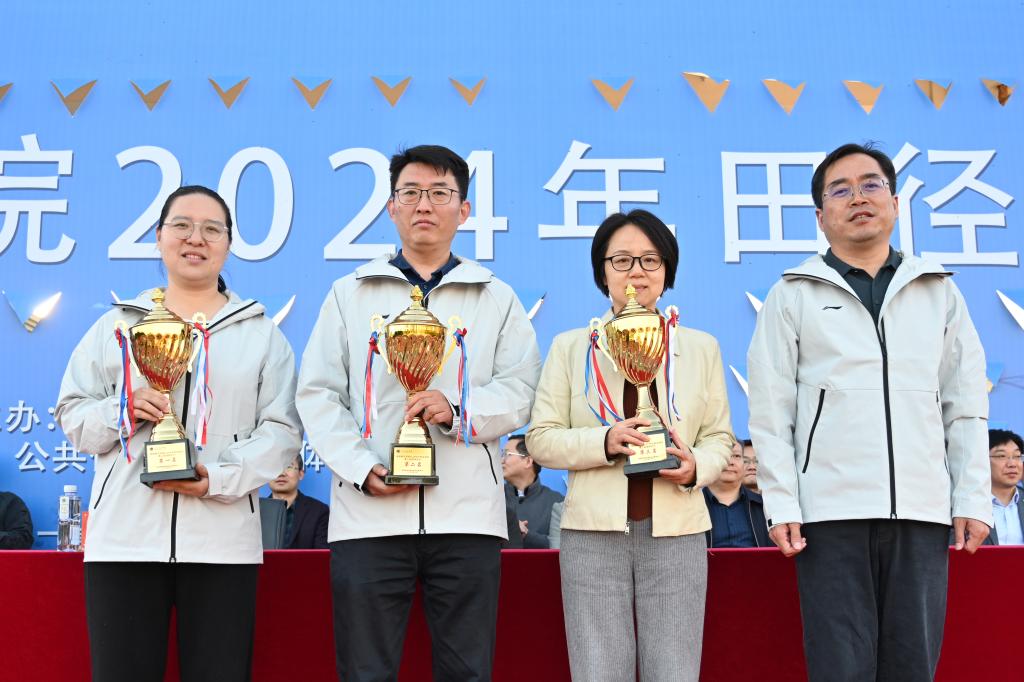 在洛阳师范学院2024年田径运动会中,教辅单位分工会凭借卓越的团队精神和出色的竞技水平,荣获教工组团体总分第一名。在教青组女子200米、女子跳远,教壮组女子立定跳远、男子立定跳远、女子200米等项目中,教辅均获项目第一名。