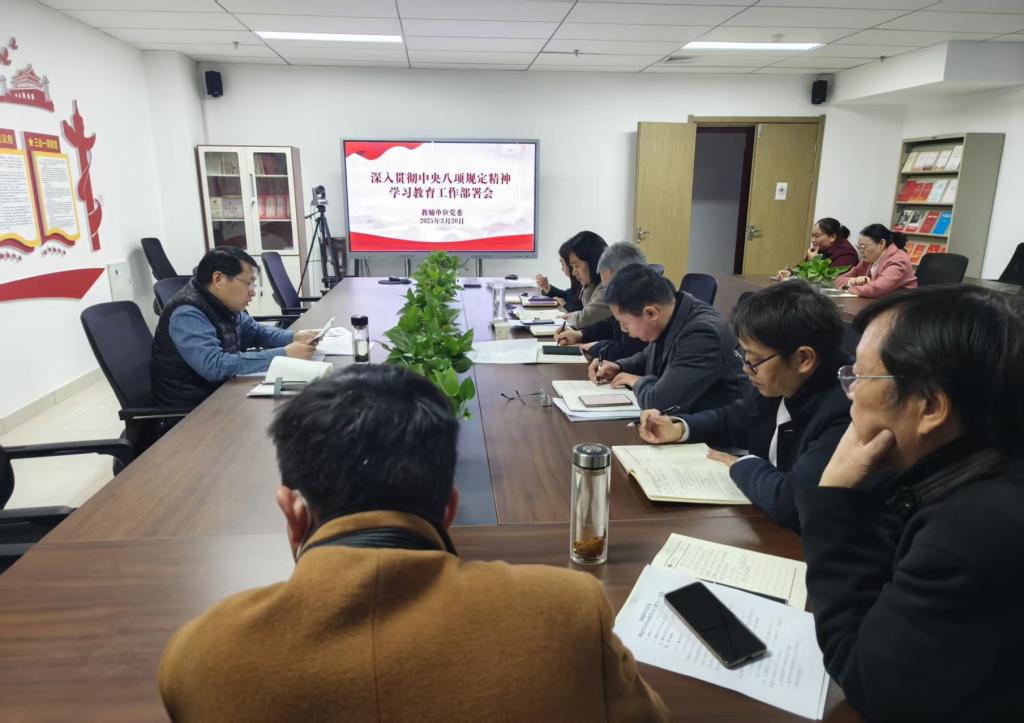 会议强调,各党支部书记要充分认识开展深入贯彻中央八项规定精神学习教育的重要意义,切实结合部门实际,将学习教育作为强化政治担当、锤炼党性修养的关键举措,把深入贯彻中央八项规定精神学习教育转化为改进工作作风、提升服务效能的强大动力,在服务保障中传递教育温度,在管理细节中彰显育人情怀,为学校建设高水平师范大学提供坚实支撑。会议还就教辅单位党委具体的学习教育计划、时间安排等进行了部署,确保学习教育工作有序开展,取得实效。