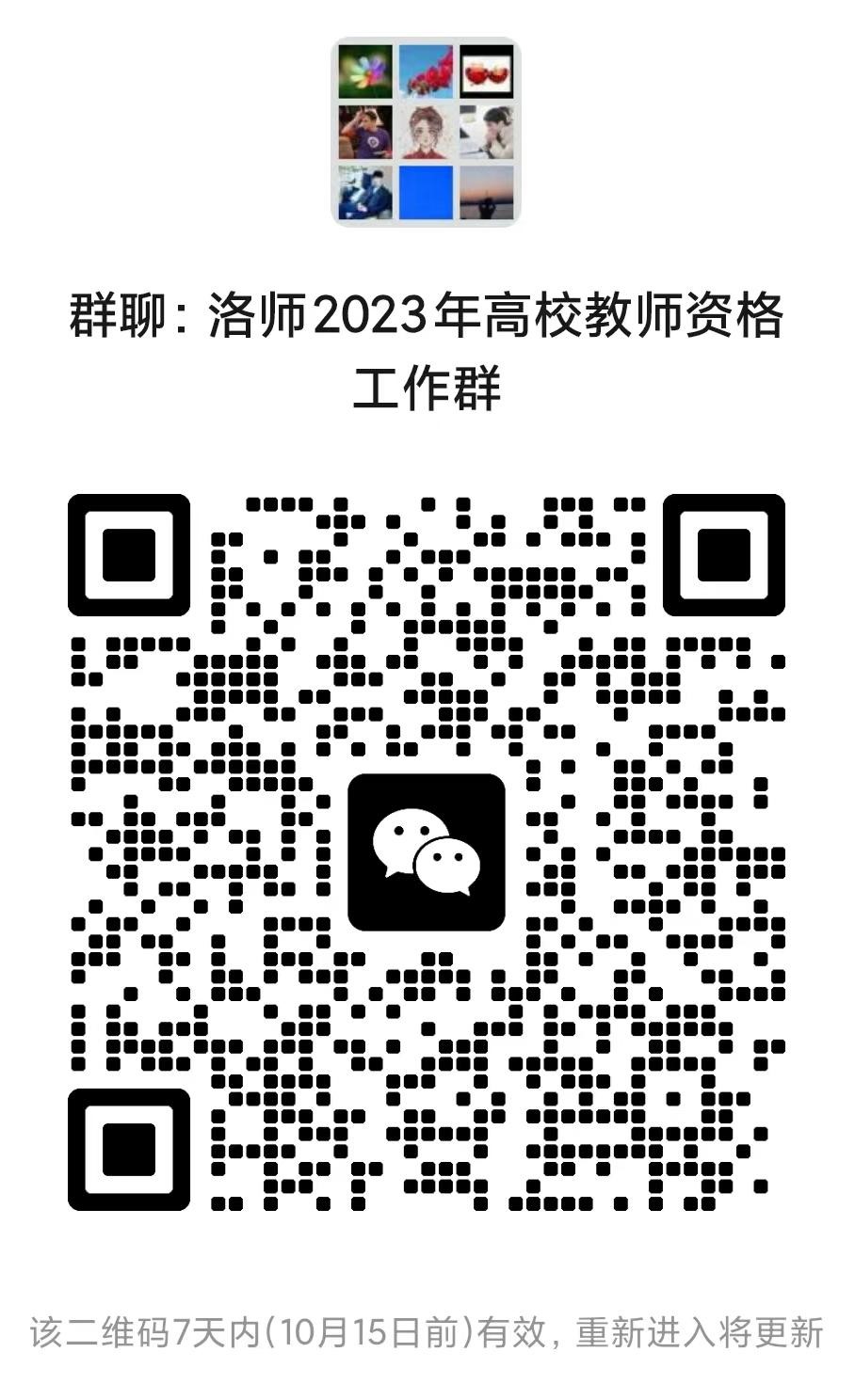 2.参加本次认定的教师务必扫描下方二维码加入洛师2023年高校教师资格工作微信群(进群请注明学院、姓名、联系方式),以便于开展工作。