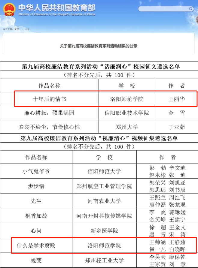 近日,由教育部举办的第九届高校廉洁教育系列活动结果揭晓,我校纪委监察专员工作办公室王丽华老师创作的作品《十年后的情书》与新闻传播学院学生王帅涵等人共同创作的作品《什么是学术腐败》分别荣获“话廉润心”校园征文和“视廉清心”视频征集优秀作品。