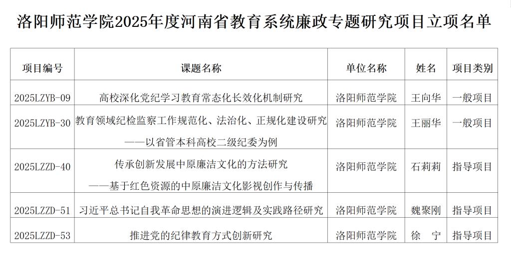 近日,驻省教育厅纪检监察组下发《关于2025年度河南省教育系统廉政专题研究项目立项的通知》(豫驻教纪监发〔2025〕8号),我校5项课题获批立项,其中一般课题项目2项,指导课题项目3项。