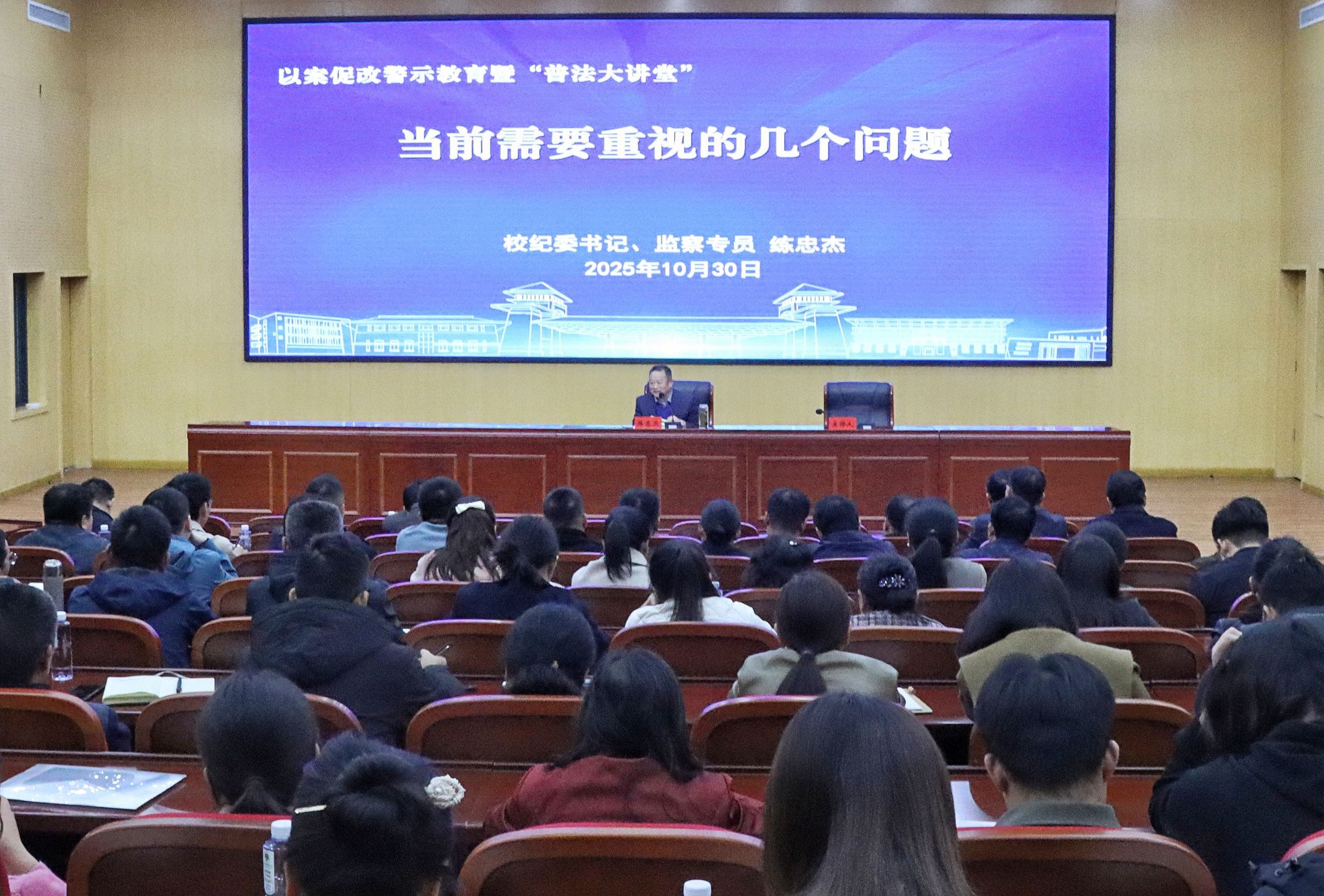 10月30日下午,学校举办以案促改警示教育暨“普法大讲堂”,校纪委书记、监察专员练忠杰以《当前需要重视的几个问题》为题作专题报告,全校教职工以线上线下相结合的方式参加。