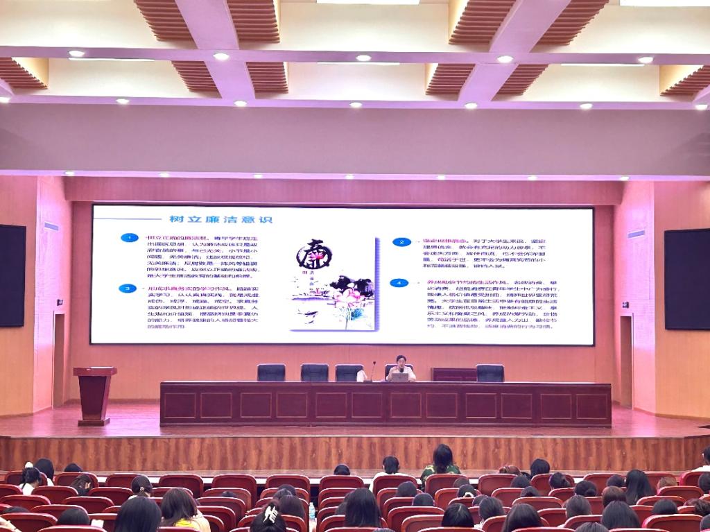李佳从“规范大学生行为” “倡导文明做人”以及“大学生廉洁教育的思考及启示”三个方面深入阐述了大学生行为规范的主要内容,并结合典型的不文明和不廉洁行为,强调廉洁修养是大学生极为重要的品格。她指出,新时代大学生要筑牢信仰之基,清清白白做人,树立正确的世界观、人生观、价值观;要常怀敬畏之心,遵守校纪校规,诚实守信,求真务实,谨言慎行、防微杜渐,扣好人生第一粒扣子;要志存高远、心怀天下,努力学习,报效祖国,为实现中华民族伟大复兴的中国梦贡献青春力量。