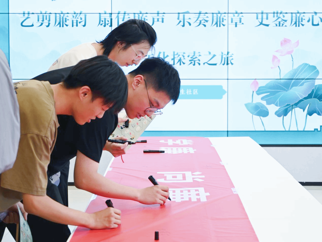 活动设置了“知廉行远”“篆韵寻踪”“清风绘廉”“青音嘹亮”“观廉抒怀”“清风立约”等环节。在“知廉行远”与“篆韵寻踪”答题闯关中,参与者通过抽取题卡、在艺术作品中探寻答案,在互动中汲取廉洁知识、拓宽文化视野;在“清风绘廉”“青音嘹亮”“观廉抒怀”等环节,师生亲手制作廉洁漆扇、在乐队伴奏下传唱红歌、分享观展心得,让“廉味”与“趣味”相互交融。活动尾声,全体参与者在“学廉尚廉 守廉践廉”背景墙上郑重签名,将沉浸式体验升华为庄严的廉洁承诺。