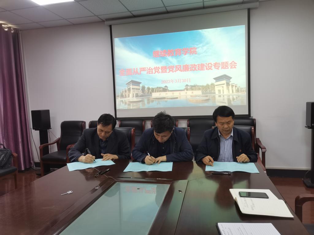 3月30日下午,继续教育学院在A6-429会议室召开2023年全面从严治党暨党风廉政建设工作专题会议。学院领导班子成员、全体教职工参加了会议,党总支书记周富亭主持会议。