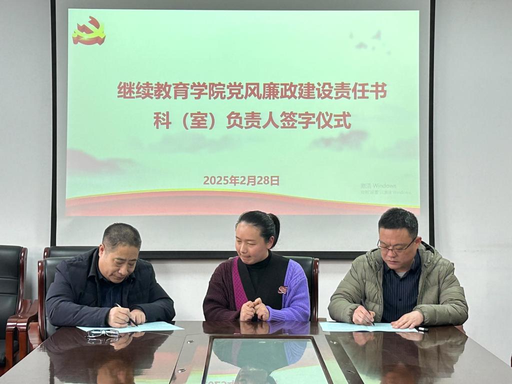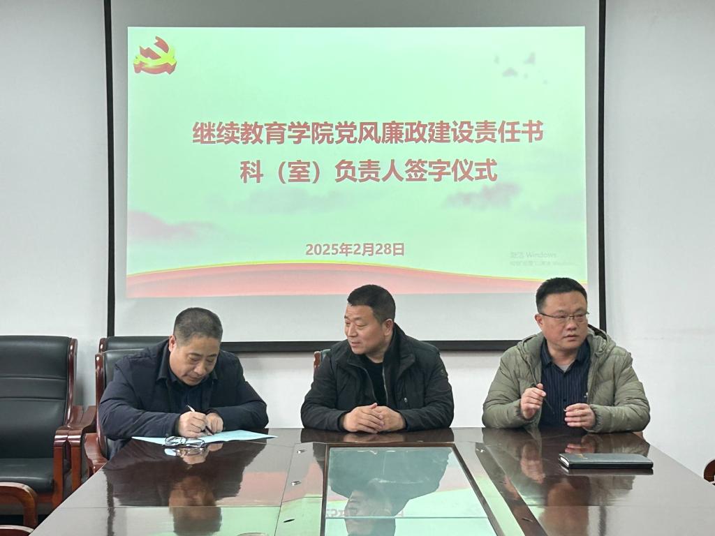 为有效落实党风廉政建设责任制,2月28日,继续教育学院举行了2025年度《党风廉政建设责任书》科(室)负责人签字仪式.