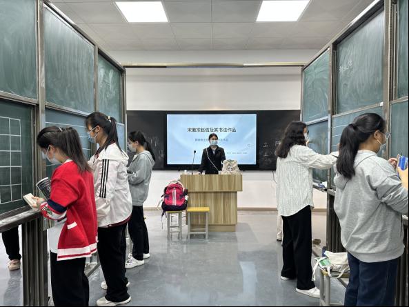 4月30日第3节,尚彩怡老师在G3-405板书训练专用教室讲授了粉笔字——竖画的书写技巧。这是一门地理科学专业师范生的教学技能训练课。教学过程采用分组讲解模式、教师例字演示、学生自主练习、教师答疑指导、生生帮互助的形式,深入讲解粉笔垂露竖、悬针竖的起笔、行笔、手笔过程,重点讲解了垂露竖行笔过程中转笔动作。学生书写认真,练习热情高涨。