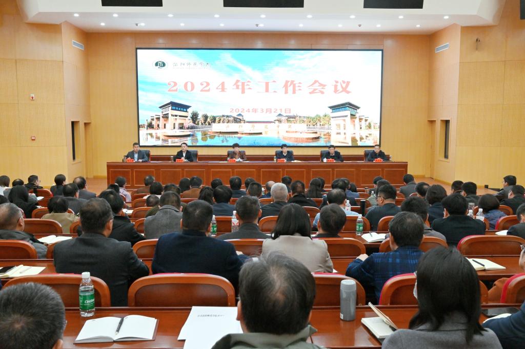 3月21日下午,学校在成均楼B106报告厅召开2024年工作会议。会议深入学习贯彻习近平新时代中国特色社会主义思想和党的二十大精神、中央政治局第五次集体学习关于教育强国建设的战略部署精神和全国两会精神,认真落实中央、省委关于教育的重大部署及全省教育工作会议,梳理总结工作,分析研判形势,对做好今年的工作进行动员部署。校党委书记郭改英出席会议并讲话,校长郭海明主持会议,其他在校校领导、全体中层干部参加会议。