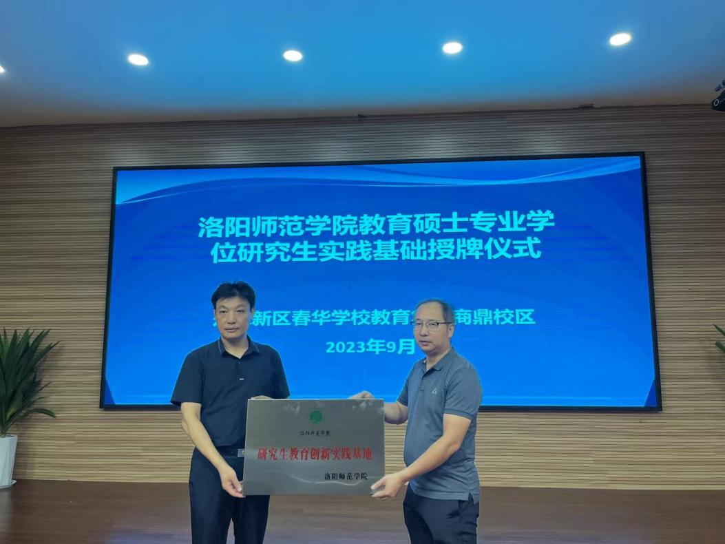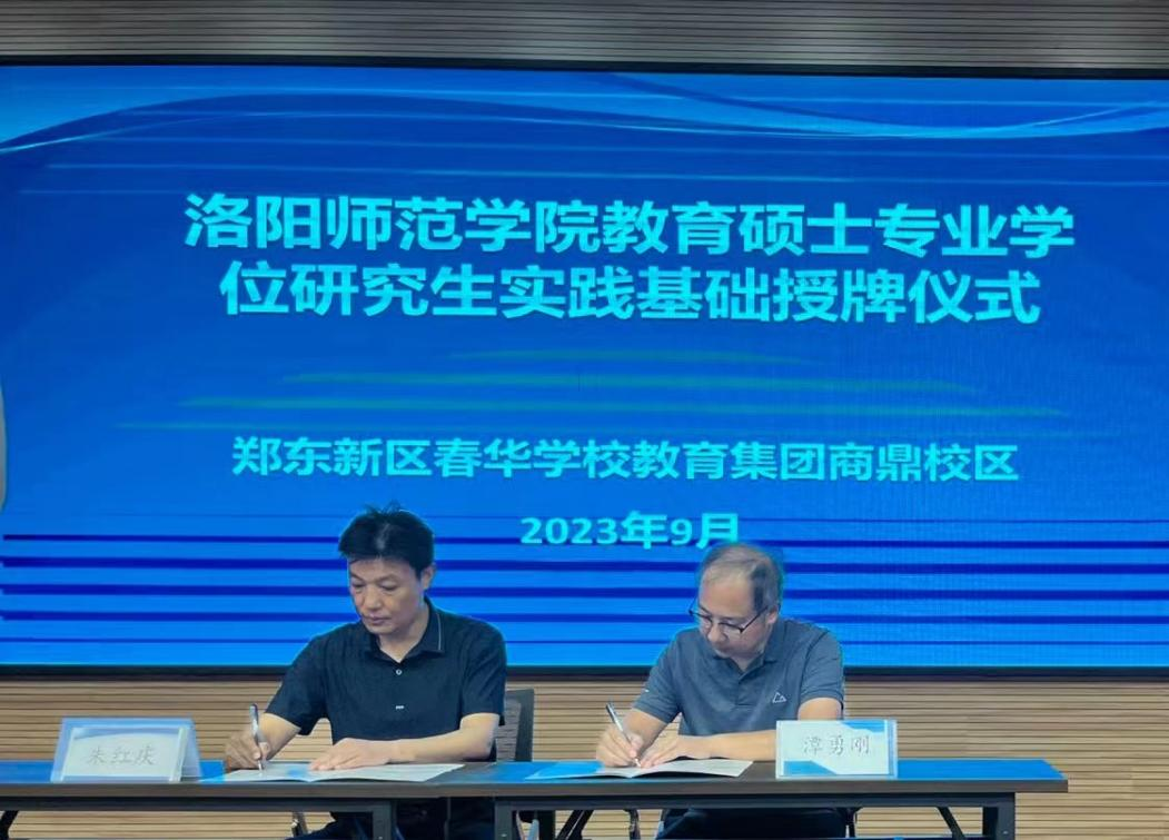 2023年9月6日,我院教育科学学院与郑东新区春华学校教育集团商鼎校区举行实习实训基地签约授牌。郑东新区春华学校教育集团商鼎校区校长朱红庆、副校长王娟、办公室主任马得朝、教务处主任慎慧文,我校研究生处副处长谭勇刚、教育科学学院副院长赵丹妮等共同出席签约授牌仪式。