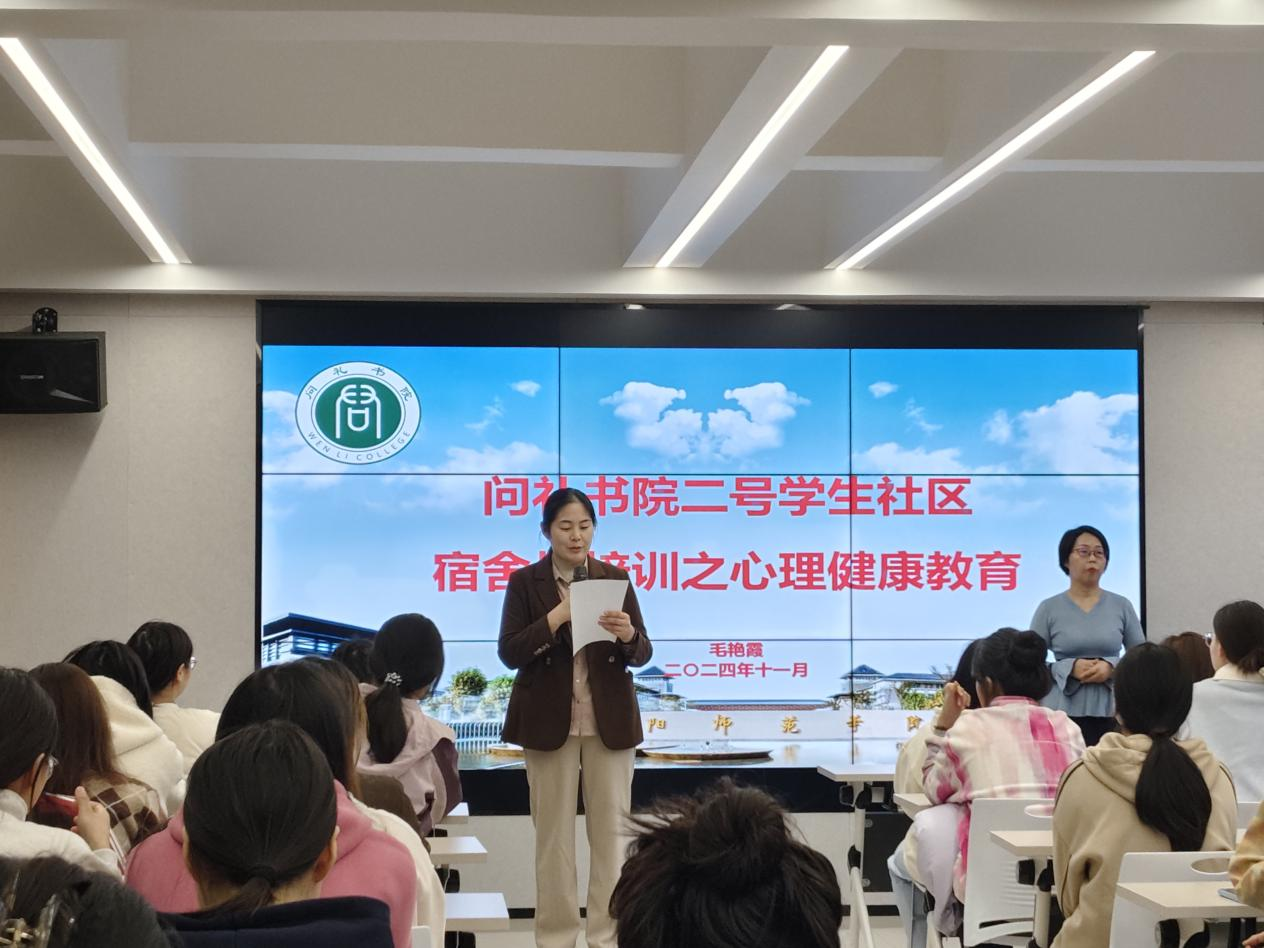 11月7日下午,问礼书院2号学生社区在求真学堂开展宿舍长心理健康教育专题培训。本次培训由教育科学学院应用心理学系毛艳霞老师主讲,2024级所有宿舍长参加。书院党委副书记蔡云改主持培训。