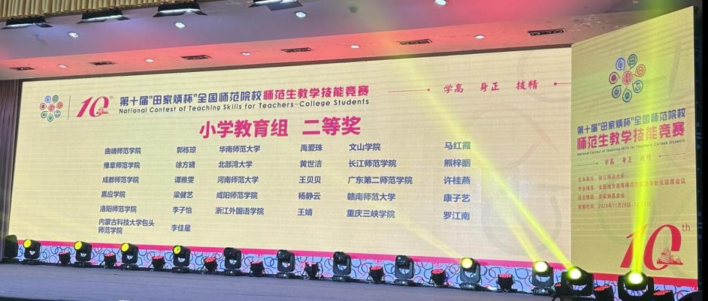 11月29日至12月1日,第十届“田家炳杯”全国师范院校师范生教学技能竞赛决赛在浙江师范大学举行。我院小学教育专业本科生李子怡凭借其深厚的专业知识和卓越的教学技巧,在众多参赛者中崭露头角,荣获全国二等奖。