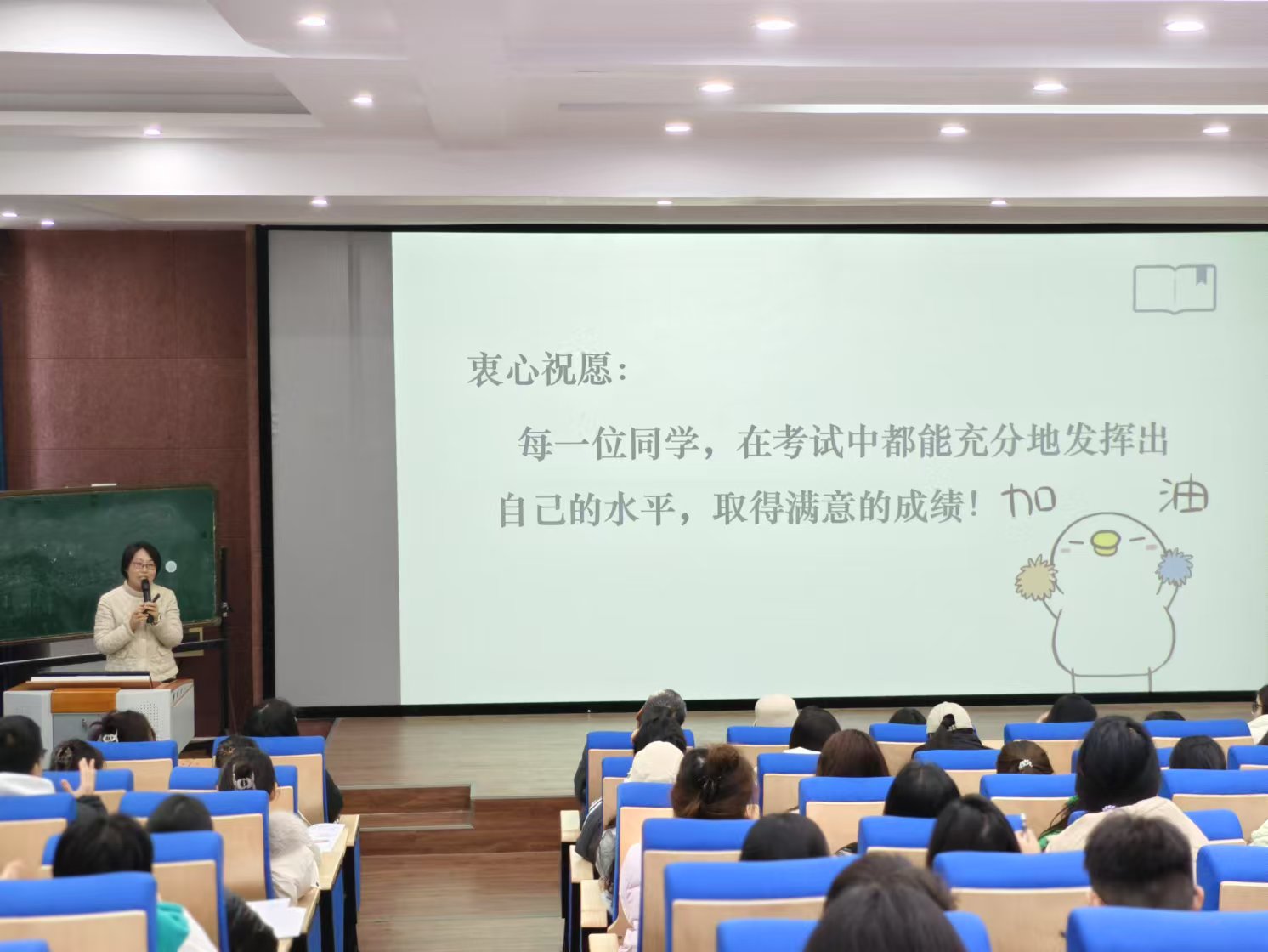 毛艳霞围绕科学备考、合理规划、调整心态等三个方面展开深入讲解,通过生动的案例和幽默的语言引导学生正确看待考前焦虑情绪,掌握调节情绪方式方法。马冰寒就考前安检工作和入场要求做了详细说明。