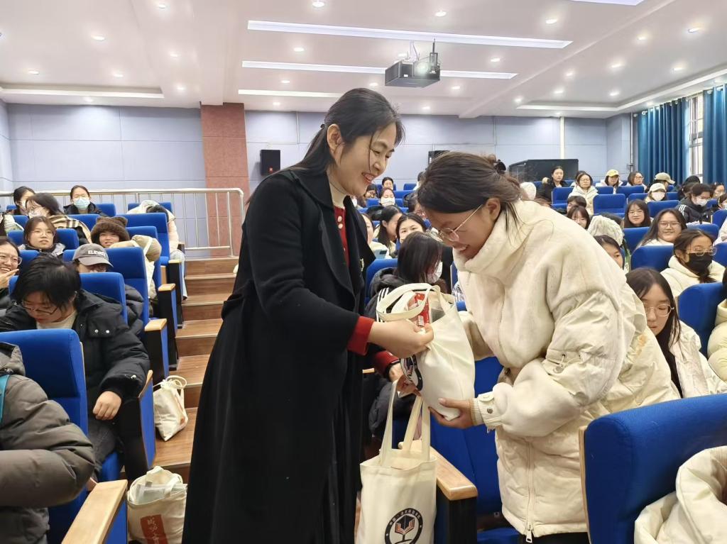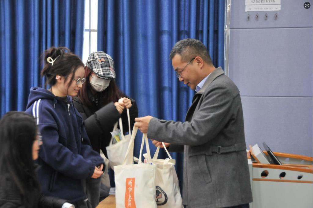 陈磊通报了我院近两年的考研报录数据,简要分析了当前就业形势与挑战,引导同学们高度重视,积极提高学历层次,但要做到“一颗红心,两手准备”,客观看待挑战与机遇。他鼓励同学们沉着冷静,积极应考,提出三点备考建议:一是保持适度紧张,提高复习效率;二是优化作息时间,提高答题效率;三是考题分类研判,注重规范答题。随后,与会老师为考研学子发放了精心准备的“暖冬加油包”,有饱含祝福的手写明信片,有寓意逢考“笔”过的文具套装,有新鲜的水果葡萄柚、橙子、苹果、梨等,寓意加油“柚”、一战“橙”硕、“苹”稳上岸、实现“梨”想。