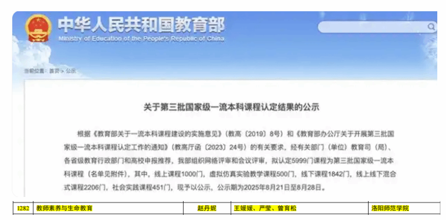 8月21日,教育部发布《关于第三批国家级一流本科课程认定结果的公示》,我院赵丹妮教授主持课程《教师素养与生命教育》获批国家级一流本科课程。