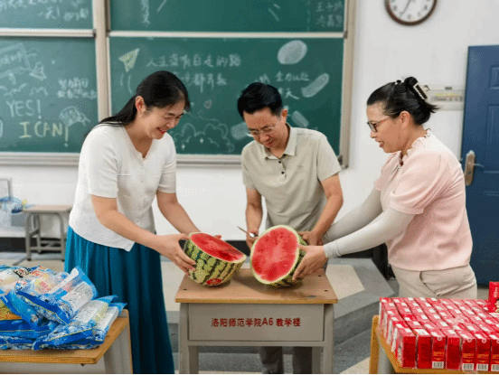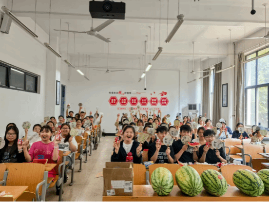 活动现场氛围温馨而热烈。老师们为正在紧张备考的同学们送上了精心准备的“考研加油包”。每一份礼包都饱含深意,清甜解暑的西瓜、寓意“一旺到底”的旺旺碎冰冰和旺仔牛奶以及写满励志寄语的折扇等。这些承载着学院浓浓情意与殷切期盼的礼物,让同学们倍感惊喜与温暖,备考的疲惫也在欢声笑语中悄然消融。