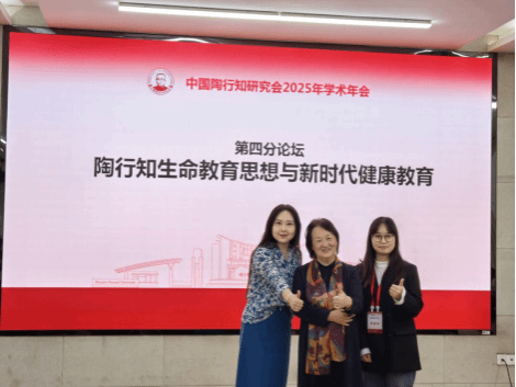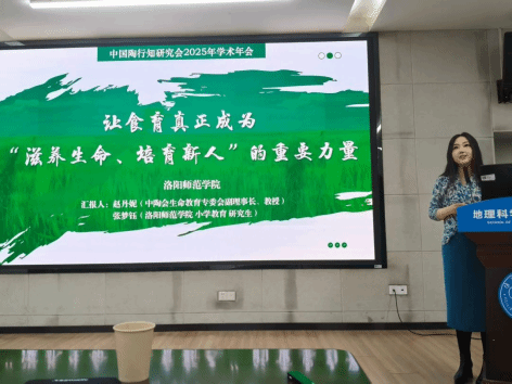 学术论坛环节设 1 个主论坛与 4 个分论坛。作为中国陶行知研究会生命教育专委会副理事长,赵丹妮教授主持 “陶行知生命教育思想与新时代健康教育” 分论坛,并作《陶行知生命教育教学观融入小学食育课程的路径研究》主题报告。报告立足儿童健康教育实践,观点鲜明、论证扎实、案例鲜活,精准回应了当前儿童食育领域的现实痛点,引发与会专家学者的热烈讨论,营造了良好的学术交流氛围。报告期间,全国政协副主席、中国陶行知研究会会长朱永新莅临会场聆听,对报告的研究方向与实践价值给予充分认可。中国陶行知研究会生命教育专委会理事长刘慧教授在点评时指出,该报告题材新颖且立足校地协同,以食育为小切口聚焦儿童健康大主题,既强化了食育的儿童性特征,更推动生命教育真正落地生根。