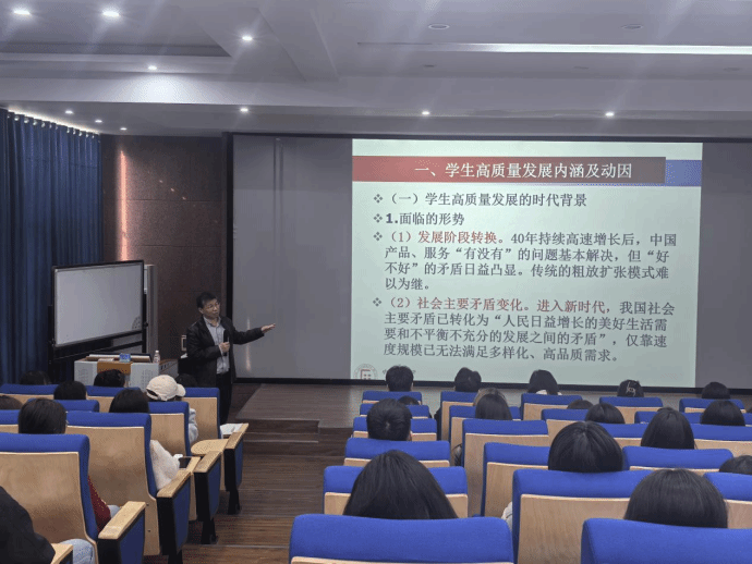 夏教授围绕国家创新驱动发展战略和高校创新创业教育的最新政策导向展开深度解读,明确提出“创新创业教育驱动学生高质量发展”的核心观点。他结合国内高校创新创业教育的普遍实践,从“德智体美劳”五育融合的独特视角,详细介绍了各院校的先进经验:通过搭建多维度支撑平台、开展个性化实践活动,为学生创新创业提供坚实机会与保障,帮助学生将理论知识转化为实际操作能力。勉励大家在创新创业实践中强化社会责任感,树立正确价值观,磨炼顽强拼搏的意志品质,在个人发展与国家战略、社会需求的紧密结合中实现人生价值。
