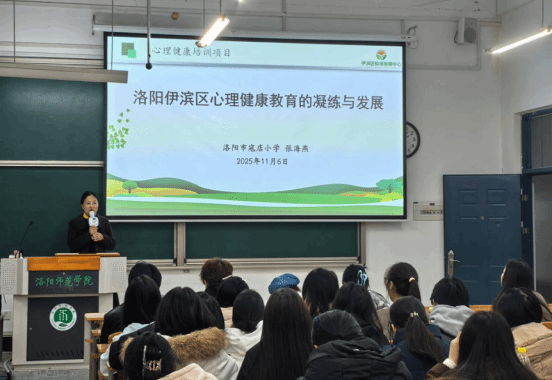 2025年11月6日下午,教育科学学院“名师进课堂”活动在A6-103教室顺利举行。本次活动特邀洛阳市伊滨区心理教研员张海燕,为应用心理学专业大一、大二学生带来题为“洛阳伊滨区心理健康教育的凝练与发展”的专题讲座。