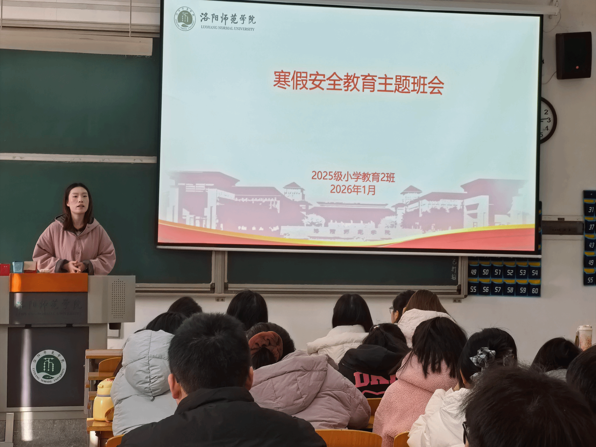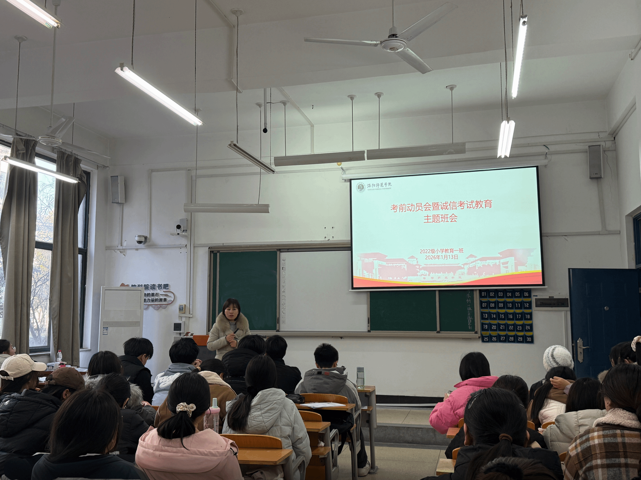 班会上,各班班主任结合《洛阳师范学院考试管理规定》等制度文件要求和考试违纪典型案例,详细阐明考试作弊、替考等违规行为的认定标准与相应纪律处分,强调诚信是立身之本、求学之基。根据学生不同发展阶段与需求,实施分层分类主题教育。大一、大二聚焦考风考纪宣讲、专业课考试指导及良好学习习惯养成;大三结合实习实践场景,开展职场诚信与职业道德教育;大四重点强化学术规范与毕业论文写作中的诚信意识,引导学生恪守学术道德、维护学术纯洁。此外,班主任们围绕交通安全、消防安全、电信网络诈骗防范、饮食卫生、网络安全等方面展开系统宣讲,切实筑牢学生安全防线。同时鼓励学生在保障安全、服从属地管理的前提下,积极参与“返家乡”社会实践、志愿服务等活动,在社会课堂中受教育、长才干、作贡献。