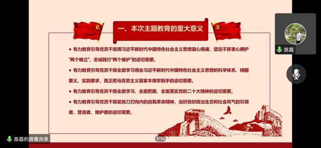 陈磊要求,要按照校党委有关部署,围绕学校“一目标、两攻坚、三大行动”重点工作,结合学院实际细化实化工作举措,一体推进理论学习、调研研究、推动发展、检视整改,把主题教育各项工作做扎实、做到位,努力把主题教育成果转化为推进学院各项工作高质量发展的实际成效。