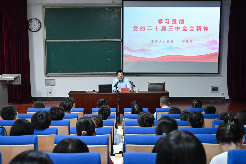 9月26日下午,校党委副书记、校长郭海明在A6-116教室为教育科学学院师生作学习贯彻党的二十届三中全会精神专题报告,教育科学学院班子成员、师生代表110余人参加报告会。