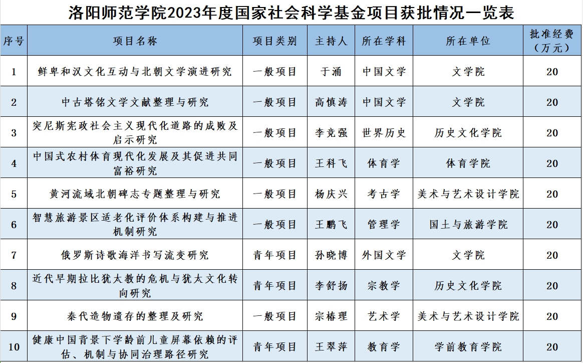 日前,全国哲学社会科学工作办公室先后发布2023年国家社会科学基金教育学项目、年度项目、青年项目、艺术学项目评审结果,我校共有10个项目获得立项资助,包括一般项目7项,青年项目3项。截至目前,项目经费资助总额200万元,立项数量位列河南省高校第4位,资助经费较去年同期增长66.6%。