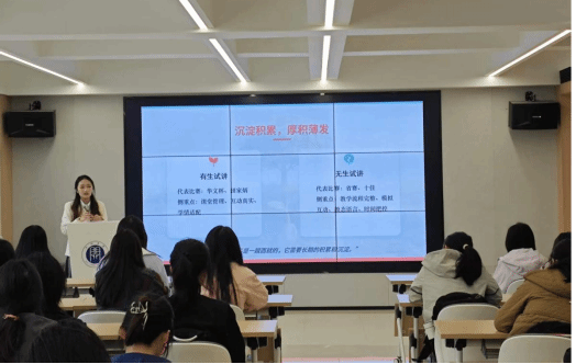 赵彬彬结合自身备赛经历与师范成长经验,以“有理想、敢担当、能吃苦、肯奋斗”为引,从“珍惜当下、拒绝安逸、沉淀积累、从容自信”四个维度引导同学们规划大学成长路径;并围绕“吃透教材、学会模仿、精巧创新、多磨多练”分享教学竞赛备赛方法,拆解从借鉴优质资源到形成个人教学风格的实用技巧,为在场同学答疑解惑,现场学习氛围浓厚,互动交流热烈。