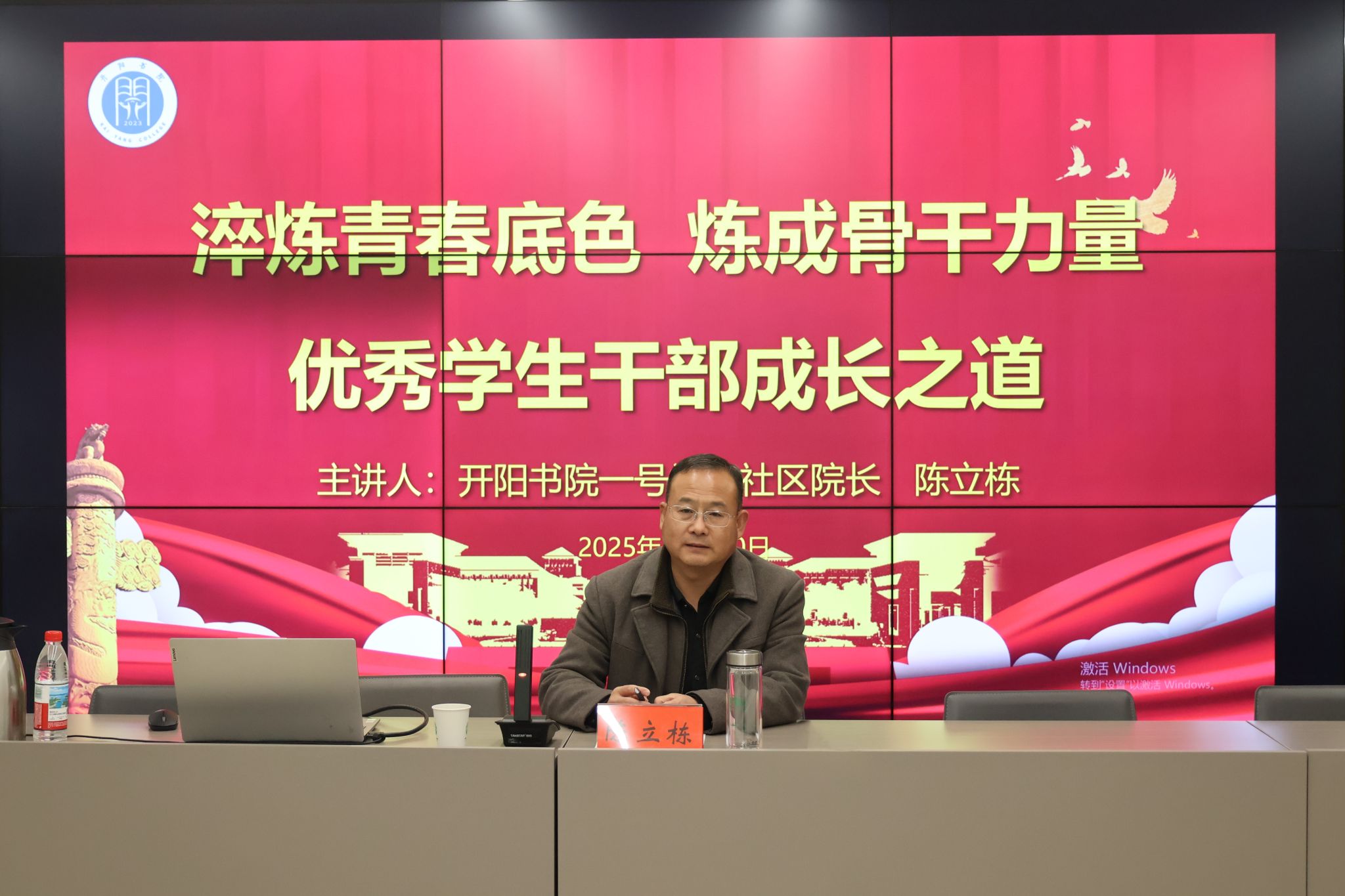 12月10日晚,开阳书院一号学生社区在书院二楼青年讲堂举办团学干部专题培训。开阳书院一号学生社区院长陈立栋以“淬炼青春底色炼成骨干力量”为主题,为全体团学骨干带来了一场内容丰富、启迪深刻的专题讲座。