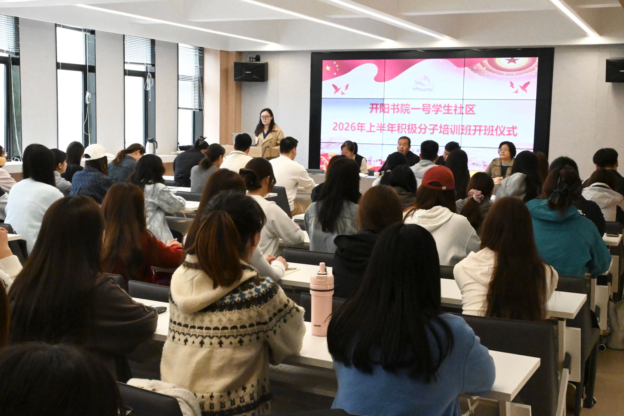 4月9日下午,开阳书院一号学生社区在青年讲堂举行2026年上半年入党积极分子培训班开班仪式。书院社区党委书记陈贯安、院长陈立栋、党委副书记池琳琳、刘杰及全体育人导师出席,2026年上半年入党积极分子参加,仪式由书院社区党委副书记池琳琳主持。