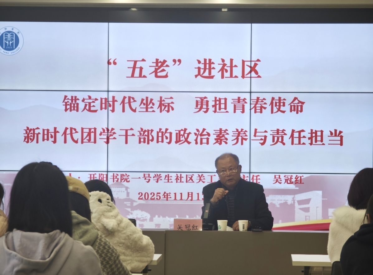 为深入学习贯彻党的二十届四中全会精神,进一步提升团学干部的政治素养与责任担当,11月13日下午,开阳书院一号学生社区在青年大讲堂举办团学干部专题培训。本次培训由社区党委副书记刘杰主持,特邀书院社区关工委副主任吴冠红担任主讲。社区全体团学骨干参加学习。