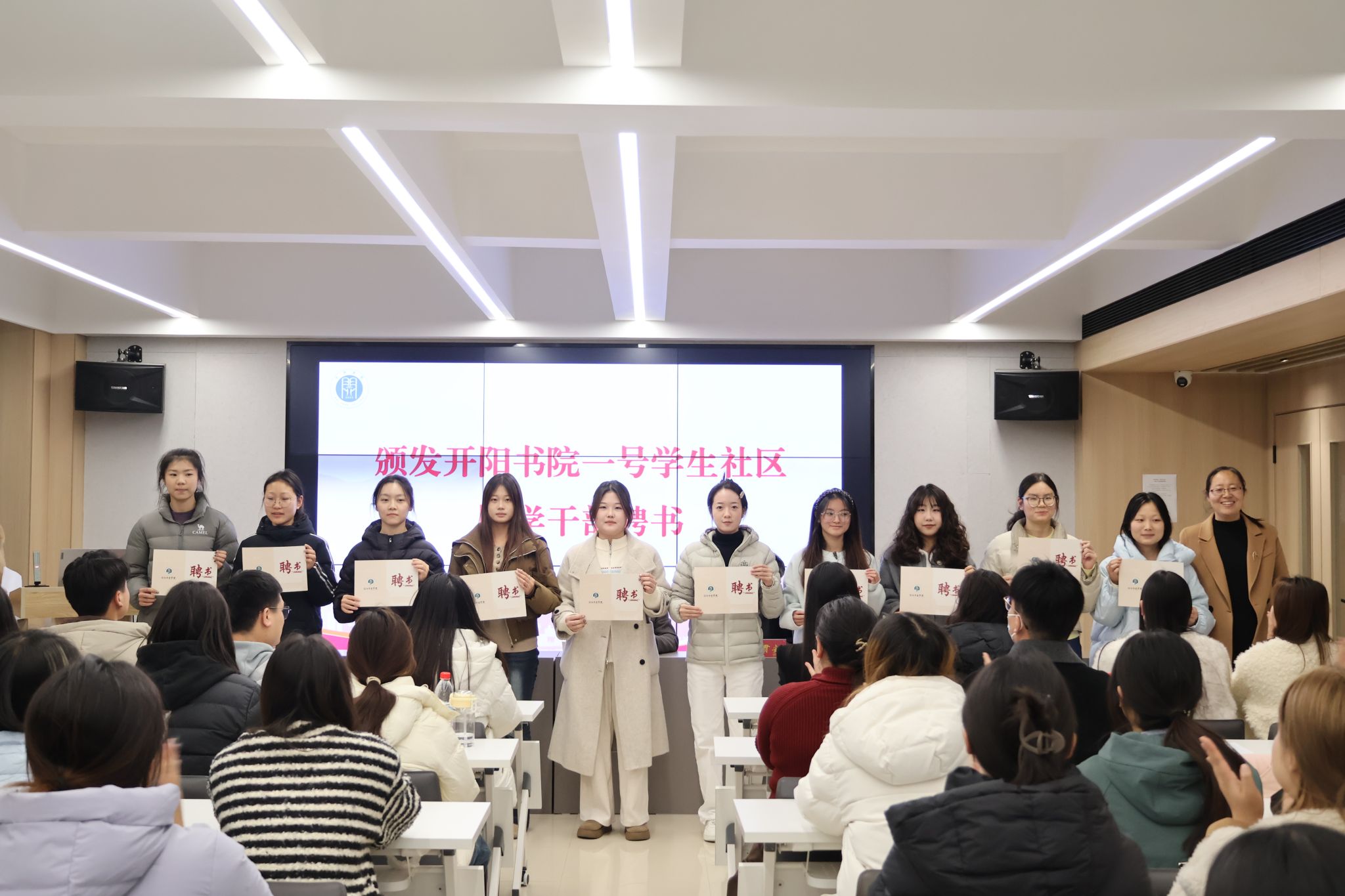 2025年11月26日晚,开阳书院一号学生社区2025年团学干部聘任大会暨团校培训开班仪式在书院二楼青年讲堂举行。本次大会由书院社区团委书记胡唯唯主持,书院社区领导班子、全体育人导师与新一届团学干部齐聚一堂,共同见证团学工作新征程的开启,为社区团学组织建设注入青春动能。