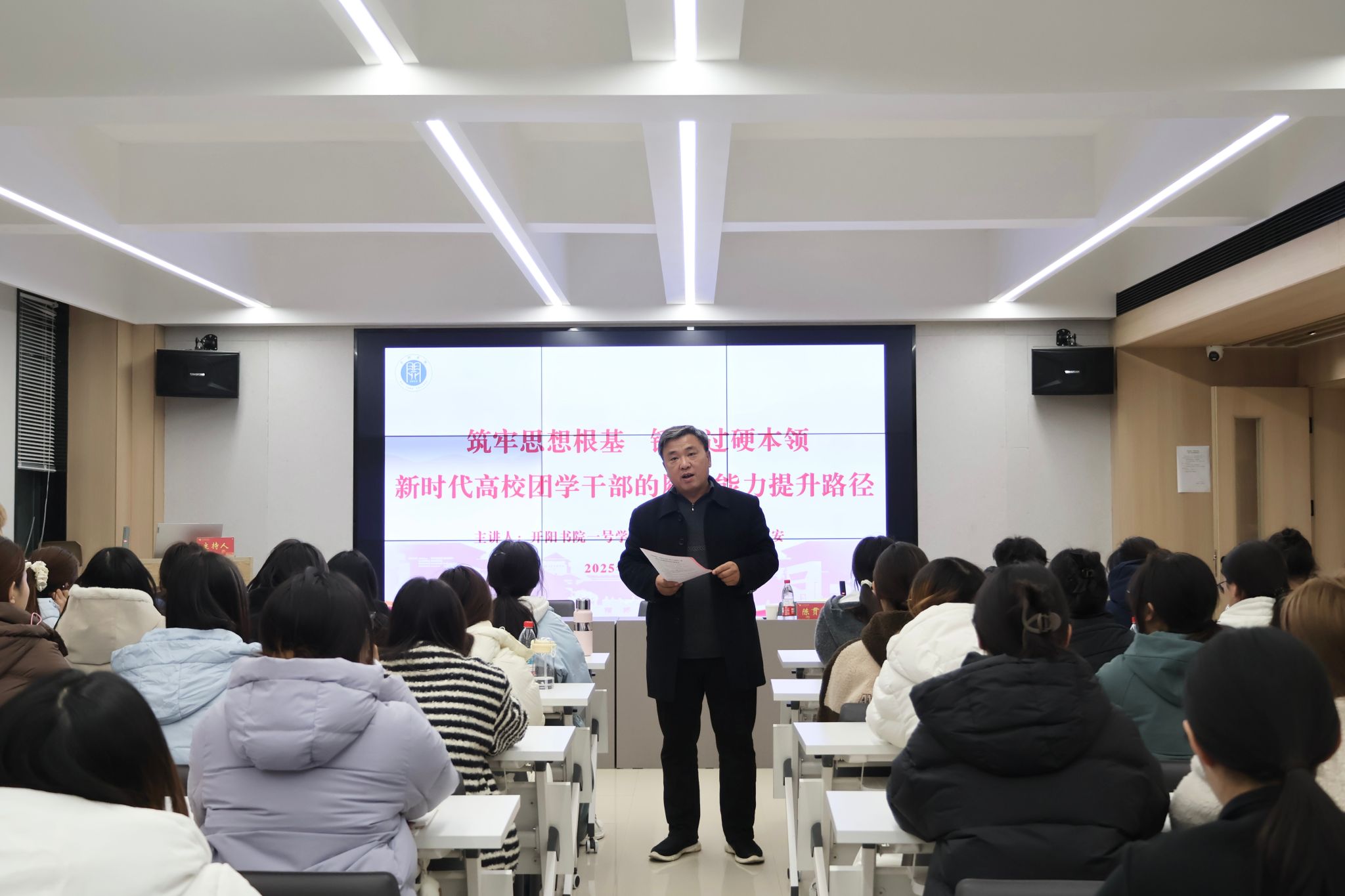 聘任大会结束后,团校培训第一讲随即开讲。书院社区党委书记陈贯安结合团学工作历史脉络与现实需求展开授课。他既从理论层面解读团学工作的重要意义,又结合实际案例分享工作方法与技巧,内容兼具思想深度与实践指导性,为新任干部快速适应岗位、高效开展工作提供了清晰指引。