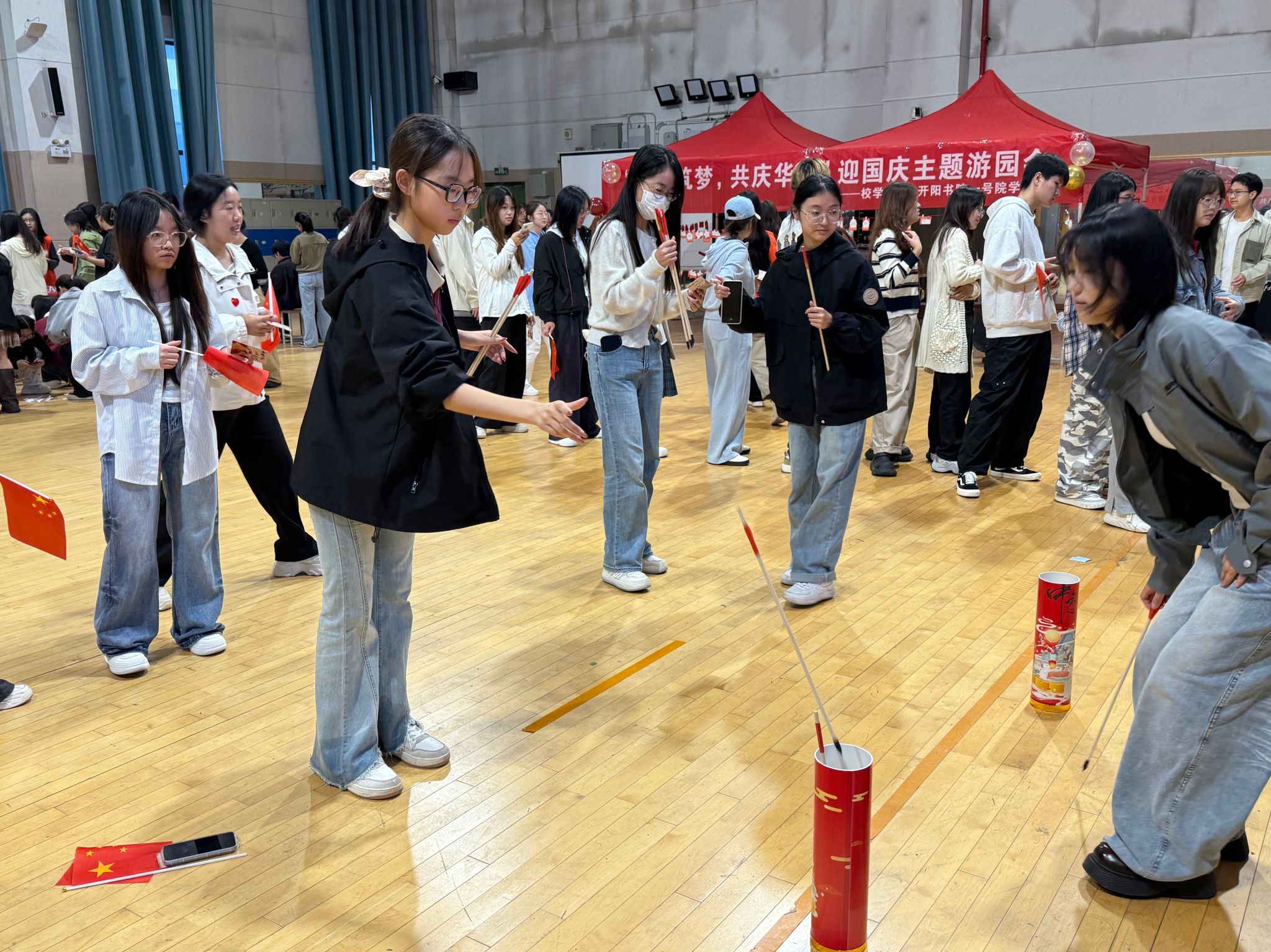 “青春筑梦,共庆华诞”国庆游园会集趣味性、互动性与教育性于一体。活动设置了趣味投壶、巧手中国结、巧度水杯等多个富含传统文化与奋斗精神的游戏环节。学子们在投壶的专注中体会目标与坚持,在中国结的编织里感悟团结与吉祥,在水杯接力中领悟平衡与稳健,游园会成功地将爱国主义教育从课堂宣讲延伸到户外体验,让青年学子在玩乐中感知文化魅力,在协作中强化集体意识,深刻理解个人成长与国家发展同频共振的时代意义,激发了为民族复兴贡献青春力量的决心。